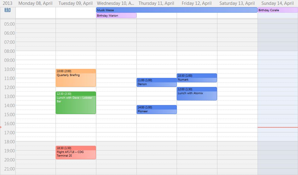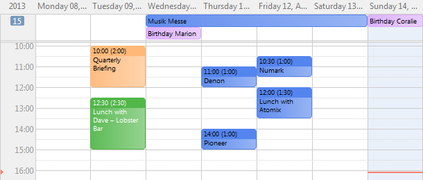 The Calendar View displays a set of CalendarEvents. These events can be hourly events (from one date-time to another), day events on one day or event day events spanning over several days.