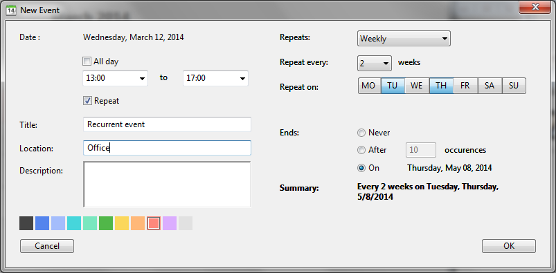 Each CalendarEvent has a start date/time and end date/time. The Title, Location, Description and Color of each event can be defined.
