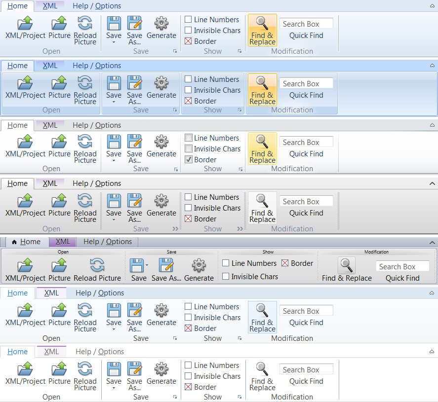 1The Ribbon is used in Microsoft Office on different platforms and with different styles. To enable consistency with the end-user's environment and also enabling custom design, the Ribbon control for RealBasic comes with 7 different themes: