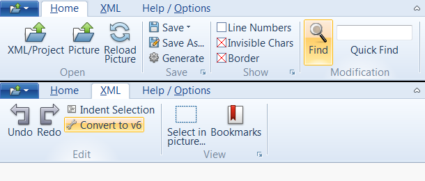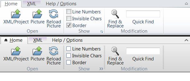 The Ribbon Control automatically resizes the buttons following the priority given by the developer to each section. Buttons are either displayed as normal or horizontal. When no more space is available, sections are collapsed and displayed as an "overflow" element.RibbonButtons can be displayed as a regular pushbutton or can be appended a menu that will popup when clicking on it.