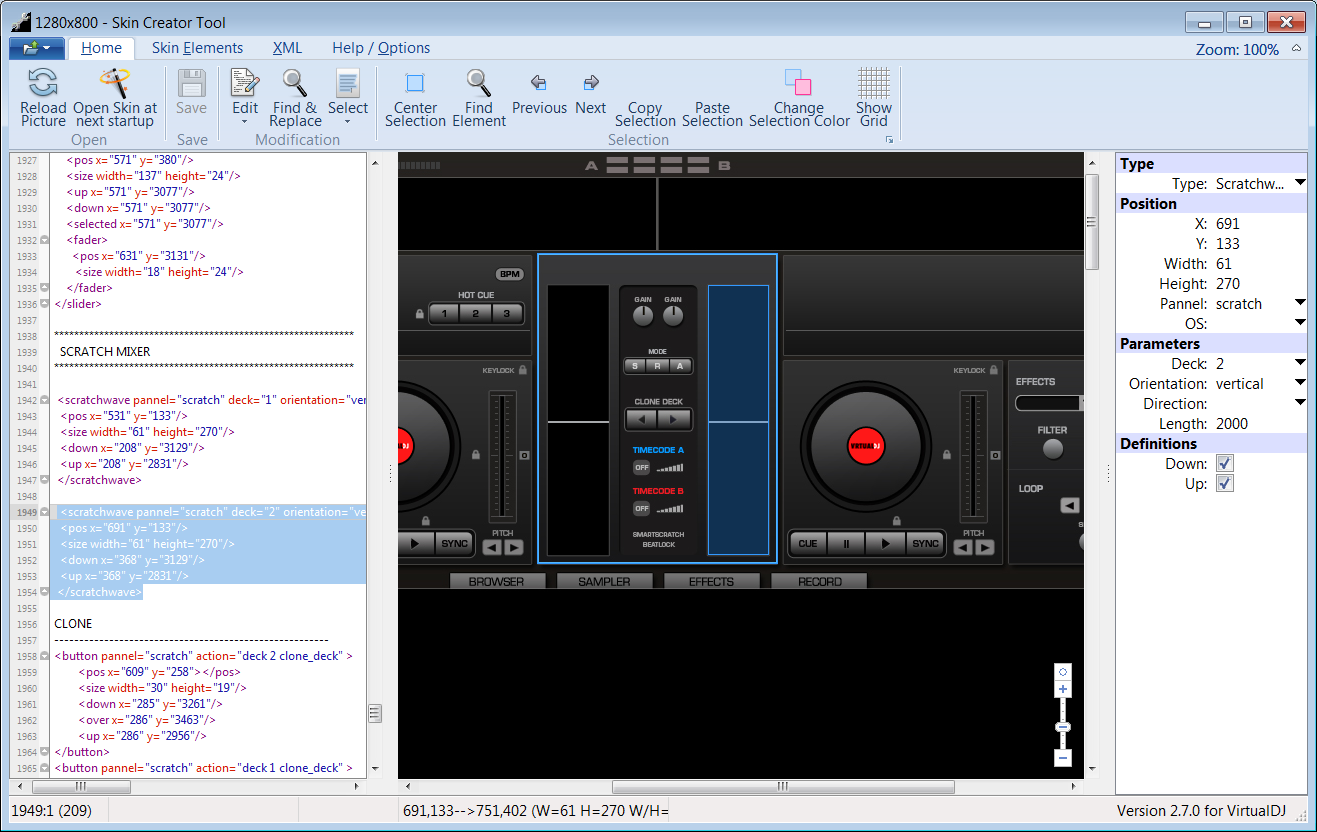This tool offers several advanced features such as XML error check to automatically check for errors before loading the Skin in VirtualDJ. Clone elements to automatically create XML code for deck 2, 3, ... using deck 1 code. Picture highlighter that analyses all XML code and highlights every position in the picture that has been coded. You will never miss a button again.