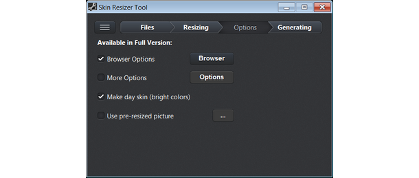 1Unzip and select the Skin you need to resize. The Skin Resizer automatically detects your screen size. If required, the ouptut size can be modified. Then select a filename for the resized Skin.