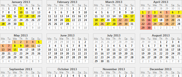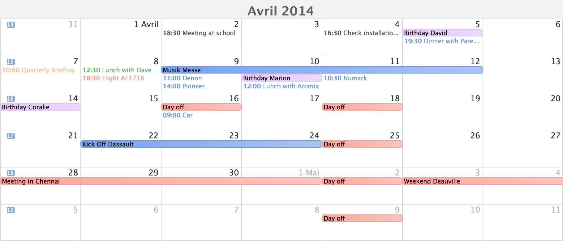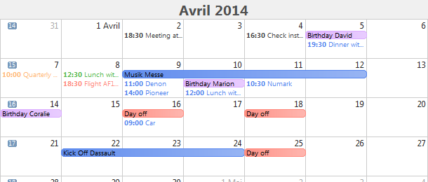 The Calendar View displays a set of CalendarEvents. These events can be hourly events (from one date-time to another), day events on one day or event day events spanning over several days.