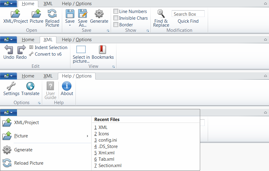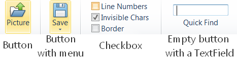 The Ribbon Control automatically resizes the buttons following the priority given by the developer to each section. Buttons are either displayed as normal or horizontal. When no more space is available, sections are collapsed and displayed as an "overflow" element.RibbonButtons can be displayed as a regular pushbutton or can be appended a menu that will popup when clicking on it.