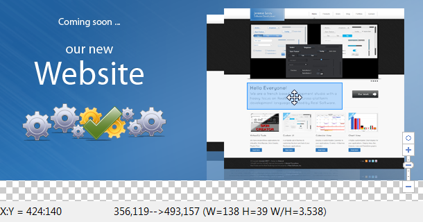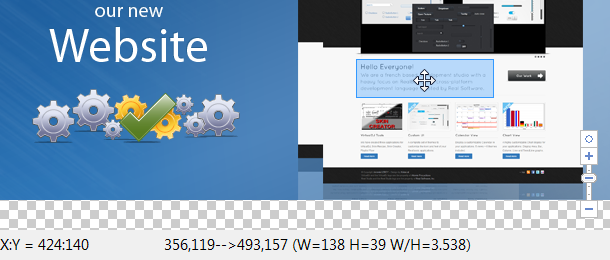 The color and transparency of the selection box can be changed, the size and color of the background tiles also. The Zoom factors are dynamic and there is an option to automatically hide the scrollbars.