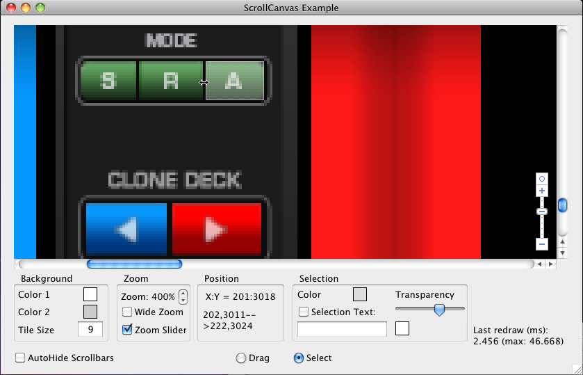 1The Scroll & Zoom Canvas has been optimized for ultra-fast scrolling and zooming. When zooming in, instead of anti-aliasing the picture, it increases the size of each pixel which helps adjusting the selection box.