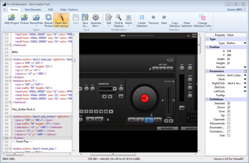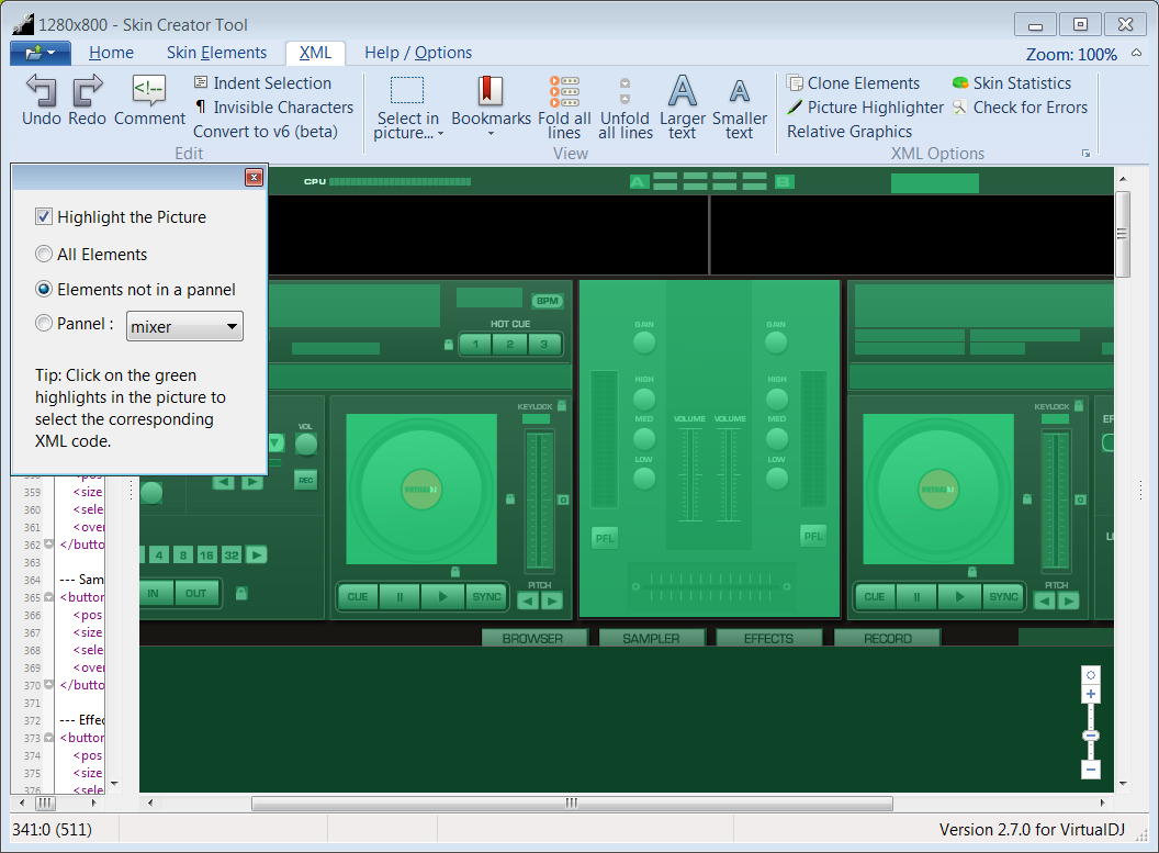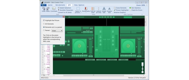 This tool offers several advanced features such as XML error check to automatically check for errors before loading the Skin in VirtualDJ. Clone elements to automatically create XML code for deck 2, 3, ... using deck 1 code. Picture highlighter that analyses all XML code and highlights every position in the picture that has been coded. You will never miss a button again.