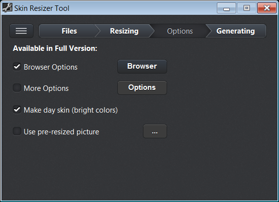 1Unzip and select the Skin you need to resize. The Skin Resizer automatically detects your screen size. If required, the ouptut size can be modified. Then select a filename for the resized Skin.