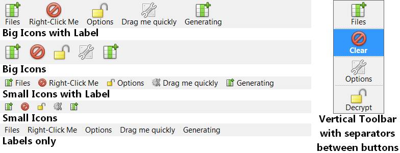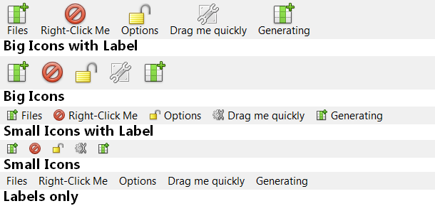 1The Toolbar offers several displays styles such as Big Icons with labels downto Small Icons with no label.