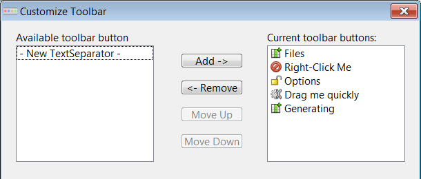 The Toolbar displays an arranged list of buttons. This Toolbar offers several button sizes and re-arranging the buttons by drag-n-drop.